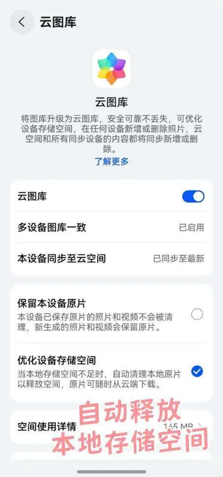 朋友给我安利了一个华为手机自带“宝藏”——华为云空间!打开里面的“云图库”,同时开启“优化设备存储空间”功能,它就能自动将手机里所有的高清原图和视频,都原封不动地同步到云端,当手机空间不足的时候,就会自动地把手机上早期的照片视频替换为小尺寸的版本,不用换手机也能给旧手机腾出少则十几GB多则几十GB的空间来。