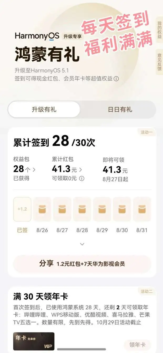 更让我惊喜的是,因为我把手机升级到了最新的HarmonyOS 5.1,在桌面右滑的负一屏,还能进入“鸿蒙有礼”活动页面,每天签到打卡,能领取各种福利就像开“盲盒”一样,比如华为应用会员、热门应用会员、元服务优惠券等等。我更是人品爆发,开“盲盒”开到了3个月的Petal One悦享套餐!这里面就包含了200GB的云空间会员服务,直接在我买的200GB空间上再叠加200GB,总共400GB完全不用担心七夕不够空间拍照片、拍视频了。