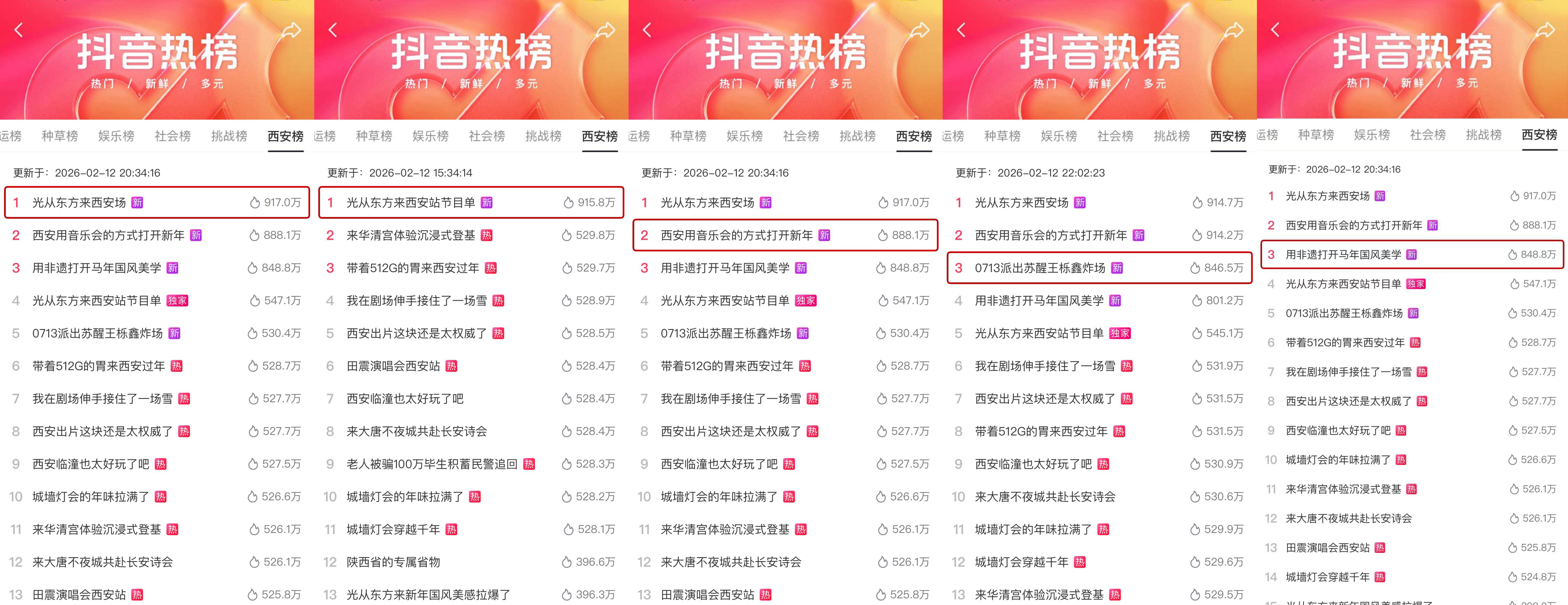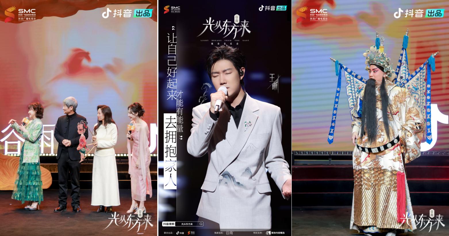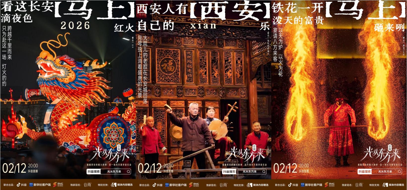 光从东方来所承载的,不仅有非遗美学与舞台能量,还有“生于斯长于斯”的地域文化。直播前期,音乐会抖音官方账号发布了一组西安城市海报,以长安碎片为底,以谐音祝福为文,借西安的民俗与非遗特色向全网提前送上新春祝福。在红火的春节档写下了独属于西安的一笔。