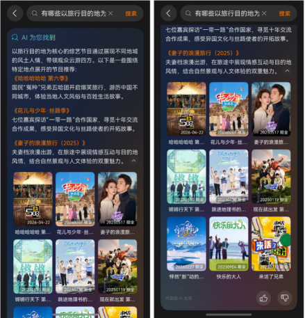 比如看完这些综艺我还是不够过瘾,直接在搜索栏进行搜索“有哪些以旅游目的地为核心的综艺节目”给我推荐了《哈哈哈哈哈第六季》和《妻子的浪漫旅行》等综艺,内容丰富到感觉假期过完还可以接着“赛博旅行”。